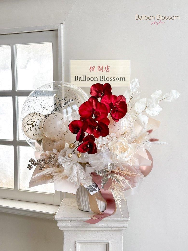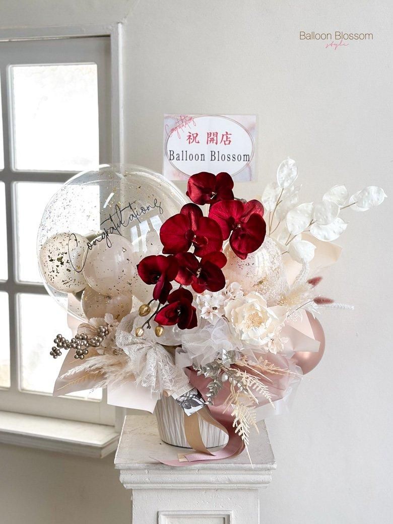 金箔バルーンと胡蝶蘭の豪華なお花の組み合わせ お祝いアレンジ ≪ガーネットレッド≫