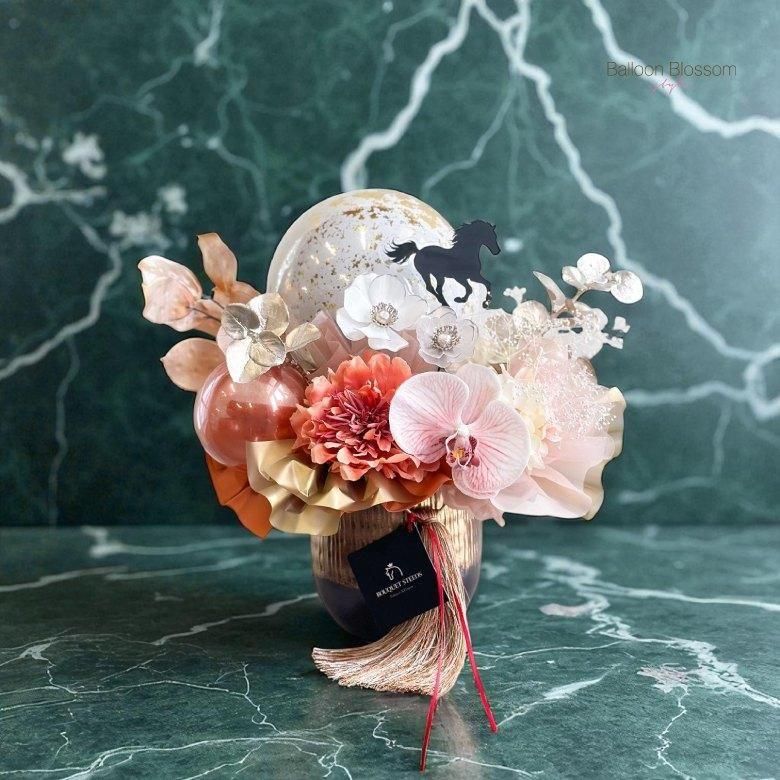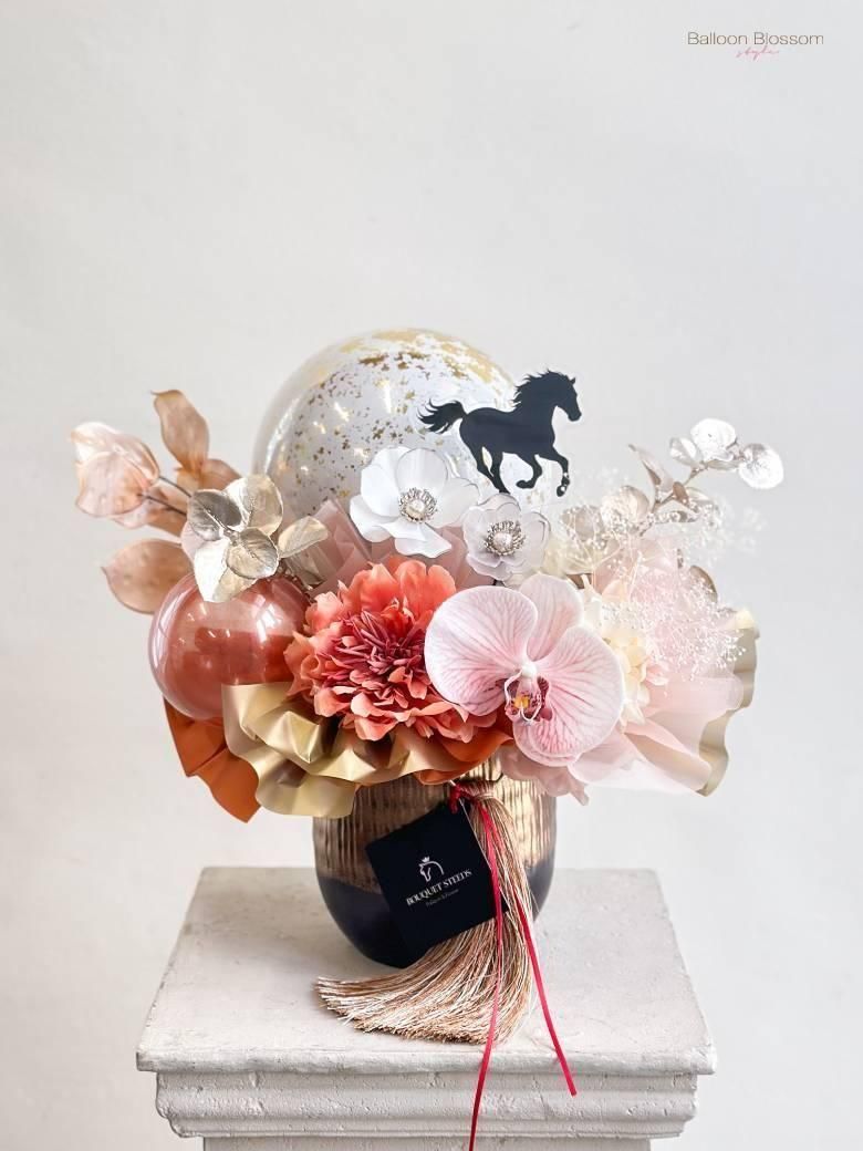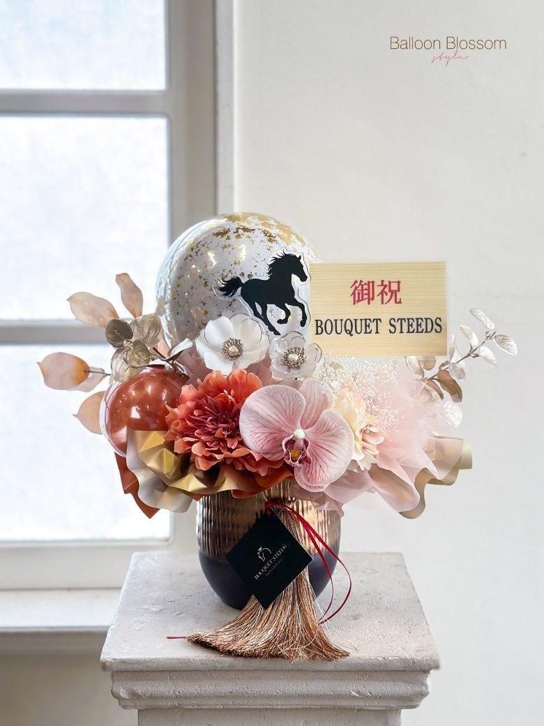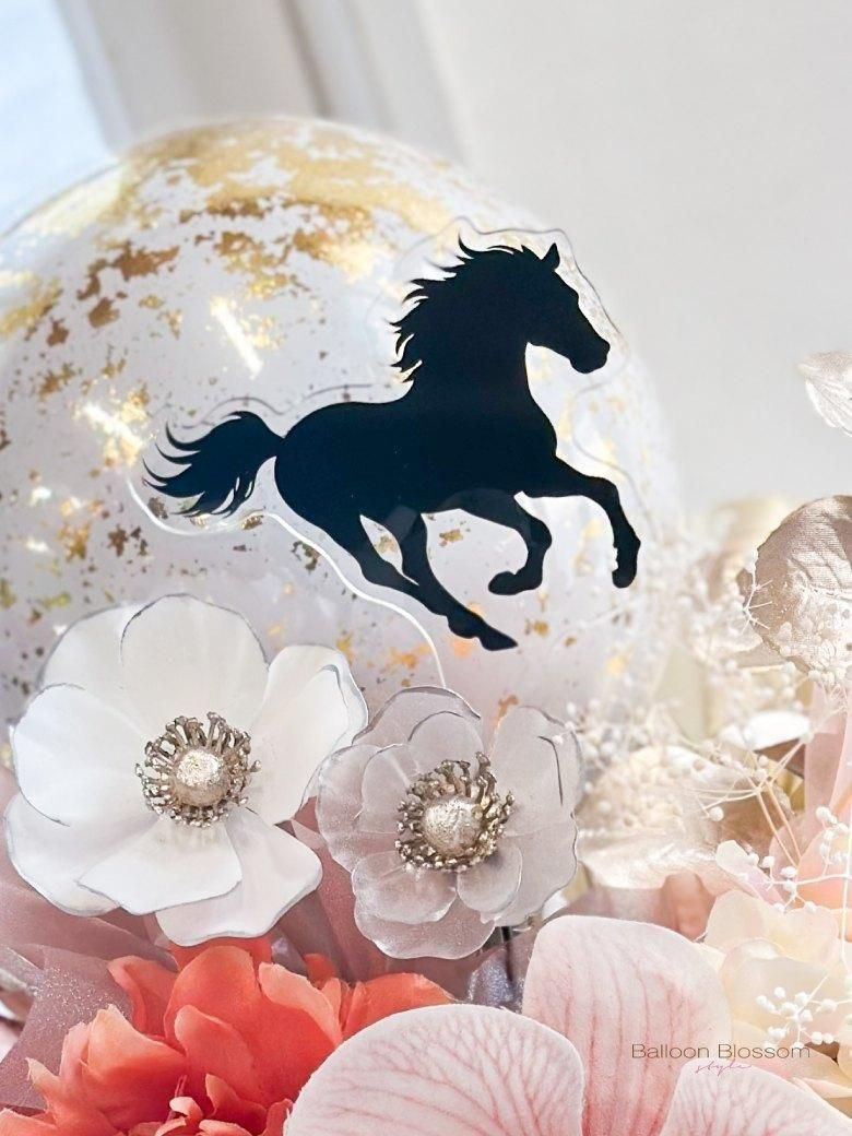 優雅に駆ける馬のシルエットと、洗練されたフラワーアレンジメントが融合した、特別なバルーンフラワー........