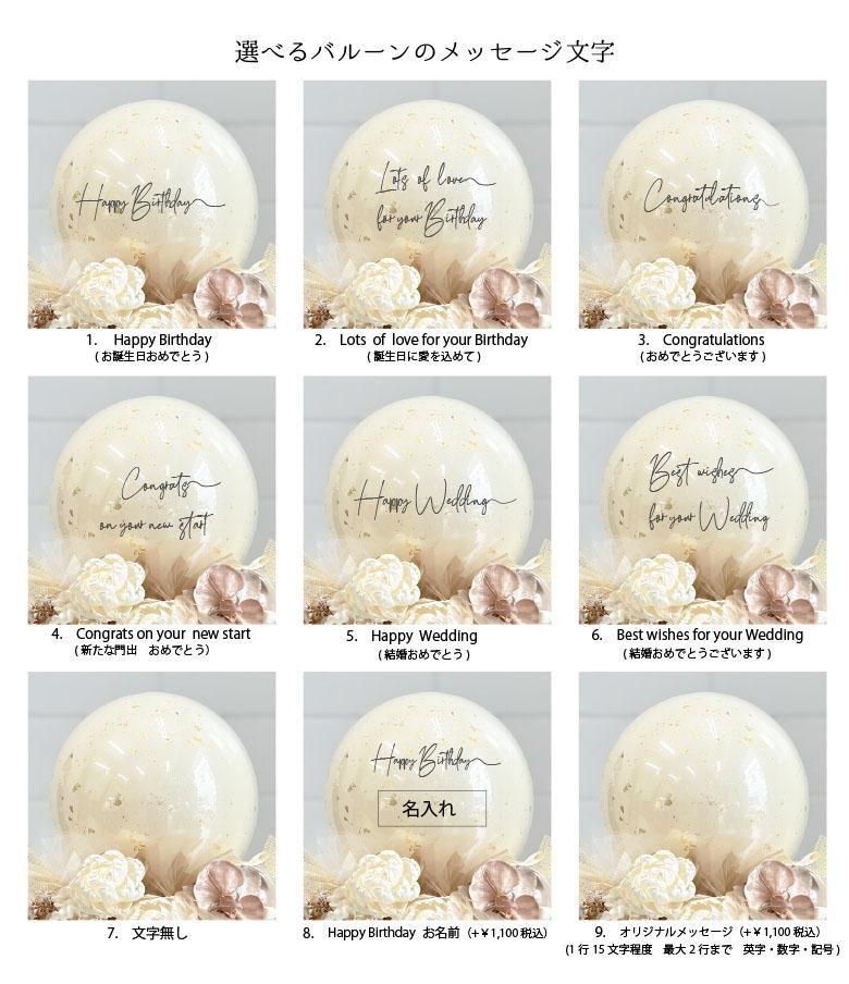 ※バルーンの文字:8.名入れ、9.オリジナルメッセージ文字 +1100円 をお選びいただきました場合、備考欄にご入力をお願いいたします。